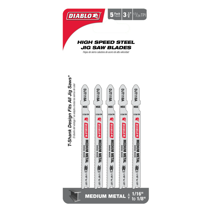 Diablo DJT118A5 3-5/8" 17/24TPI High Speed Steel Jig Saw Blades for Medium Metal (5-Pack)